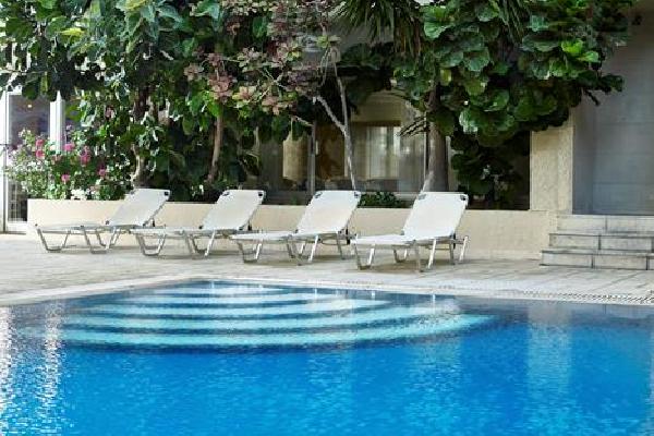 Esperia uit, Rhodos-stad in, Handdoek mee, strand vlakbij, Plons in het kleine zwembad, Smullen van het ontbijtbuffet, Slapen in prima kamers, Met een ouzo aan de bar